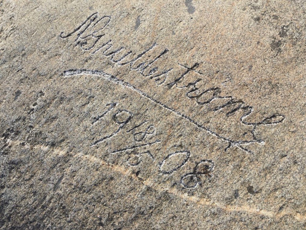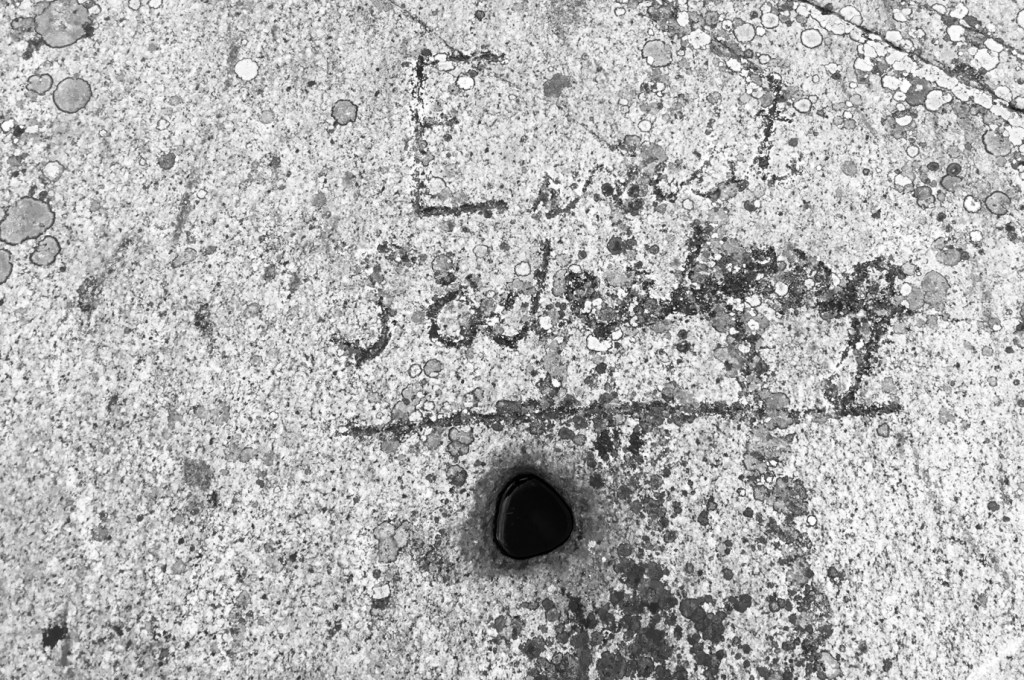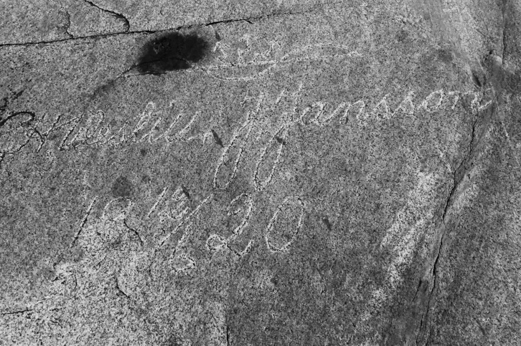 En sommardag år 1890 ristade eller högg signaturen LN sina initialer i berghällen vid havet. Det var sannolikt redan då bitvis ganska trångt mellan namnen på lämpligaste hällarna. Man kan därför anta att LN fick vandra fram och tillbaka en stund innan den rätta platsen hittades. Samma person lät samtidig föreviga en liten växt, som sedan dess slingrar sig fram över den hårda graniten.