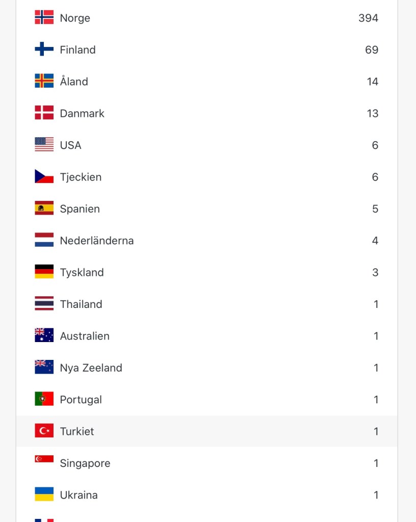 Den geografiska utbredning av er som klickat in på artikeln har är intressant. Statistiken visar att ni befinner er i världens alla hörn, från Norge, Åland och Ukraina. Till USA, Nya Zeeland, Turkiet och Singapore. Totalt handlar det om nitton länder.