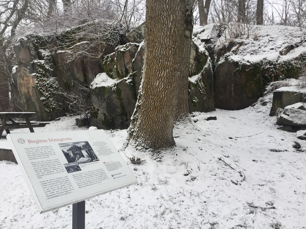 ”Grottan här intill har förändrats i olika omgångar. Man har sprängt för att få mer utrymme och jämnat till och grusat marken. Under en period fanns ett tak av cement för att göra platsen mer grottlik. Grottan utrustades på 1930-talet med ett altare som pryddes med ett krusefix och en Birgittastatyet” står det på informationstavlan.