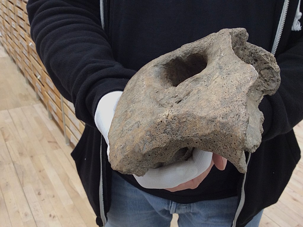 Anders Söderberg, arkeolog vid Sigtuna museum & Art, tar fram en trälåda ur museets stora magasin där arkeologiska fynd från staden förvaras. I lådan ligger en stor benbit – ett 800 år gammalt valrosskranium.