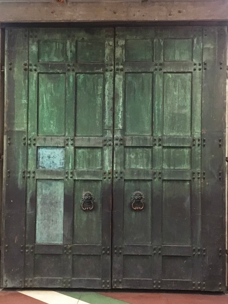 Koppardörrarna är som mycket annat en utsmyckning utan praktisk funktion. De satt en gång i Telegrafstyrelsens hus vid Brunkebergs torg i Stockholm. Huset byggdes 1837 som lyxhotell och revs 1969.