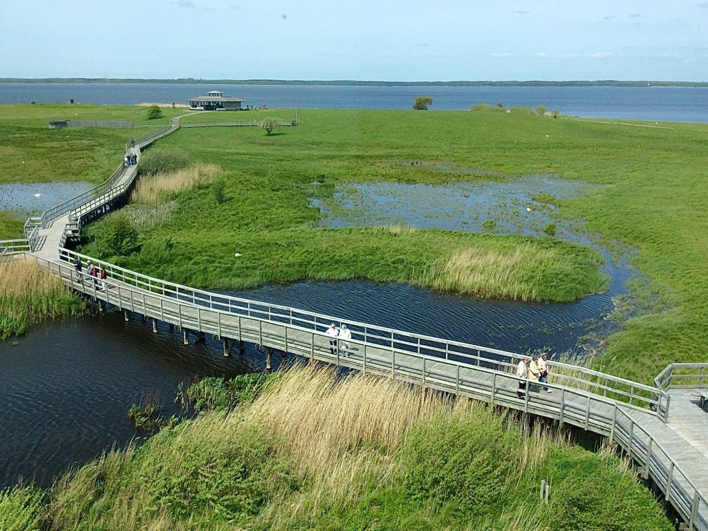 Personen följer en smal vägbank i vattnet, som längre ut på sjön övergår till en pålad spång och som sedan försvinner upp på den andra stranden.