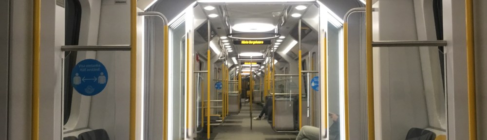 Den översta bilden är en tunnelbanevagn av senaste model, fotograferad våren 2021, i Stockholm. Inredningen påminner om en scen i regissören Stanly Kubrick ikoniska sciensfiktionfilm A Space Odyssén.