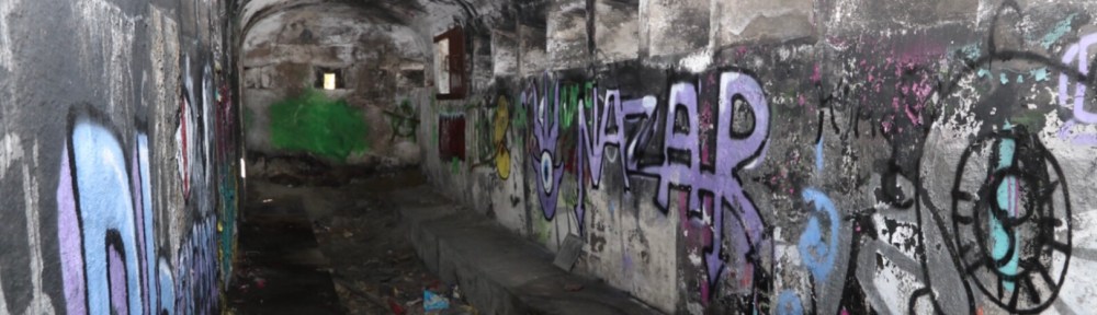 Vi går in genom Gribylundsfortet rostiga ståldörrar. Klotter syns i ljuset från dörröppningen. Längre in blir det mörkt. Vi snubblar på sprayburkar, möbler och annat bråte.