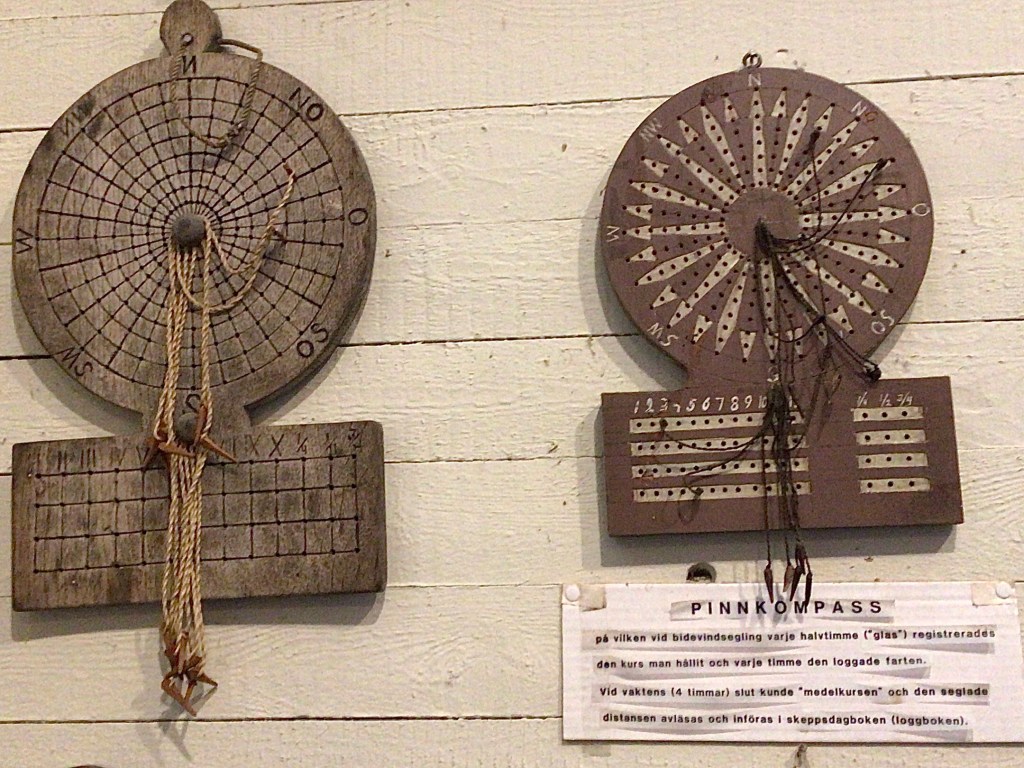 ”På träskivan finns en kompassros där vakthavande styrman satte in pinnar efter hur man seglat. Styrde man vaktens första halvtimme västlig kurs, då sattes en pinne i hålet närmast centrum på väststrecket. Vred sig sedan vinden och man styrde längre mot norr sattes en pinne närmare norr i nästa rad efter nästa halvtimme. När man så seglat en vakt om åtta halvtimmar flyttades pinnarna ihop, lika mycket från båda håll, så att man fick en generellt styrd kurs. Även distansen markerades på pinnar” skriver sjöhistoriska museet om pinnkompassen.