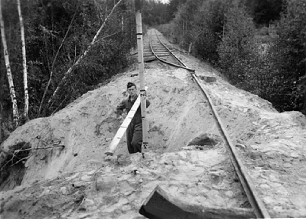 På bilderna som tillhör Järnvägsmuseet, från 1 september 1940, syns hur personal mäter bombernas kratrar i banvallen och intilliggande terräng.