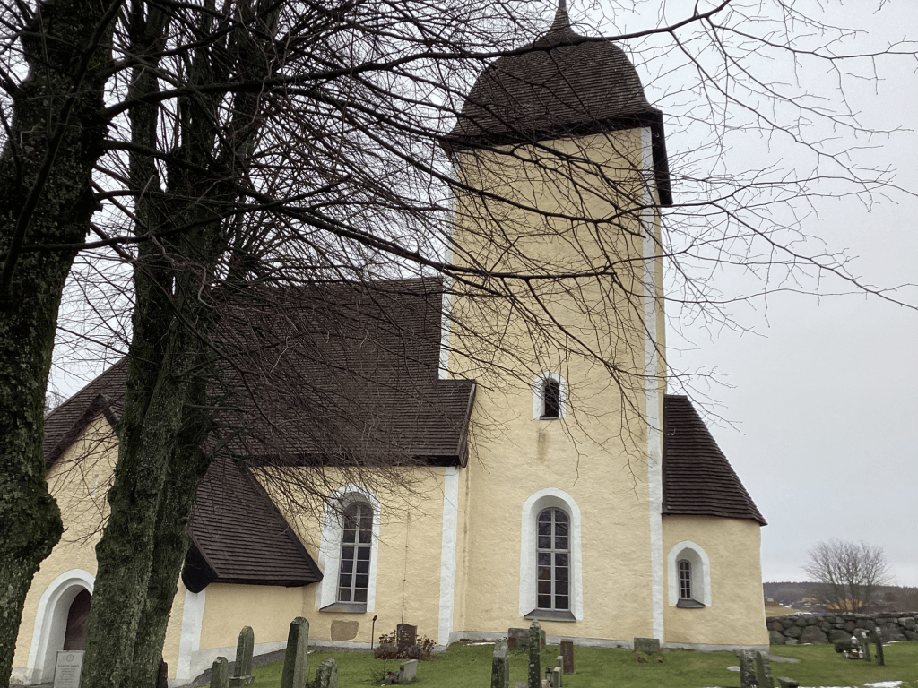 Husby Ärlinghundra kyrka, som är en östtornskyrka, började byggas på 1100-talet. Troligen har det funnits en ännu äldre träkyrka på platsen. Bortom stenmuren i bildens högra nederkant, Syns Älgesta by som svag skiftning i rött. I långhusets vägg syns den andra runstenen som Finnvids son lät resa – till minne av sig själv.