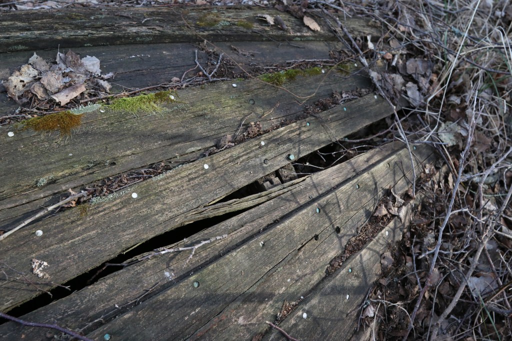 När dessa ekor drogs upp på land, en höst för länge sedan, skedde det för sista gången. De blev liggandes där. Bockarna som båtarna lades upp och ner på har mer eller mindre multnat bort. Relingarna ligger numera direkt mot den nakna, fuktiga jorden.