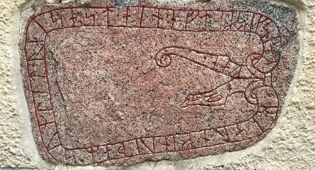 Den andra runstenen, som Björn på Älgesta, lät resa och som är inmurad i Husby Ärlinghundra kyrka.
