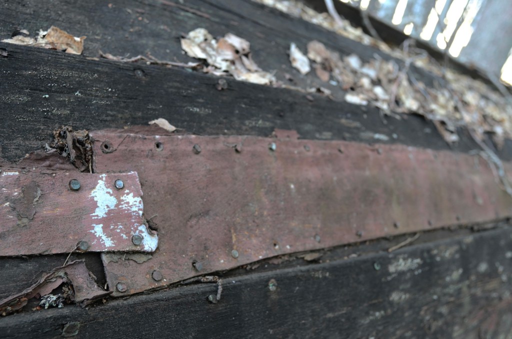 Där finns även en större eka som sticker ut med sina grova lagningar av borden. Längs med borden har rödmålade plåtremsor spikats fast över gamla hål.