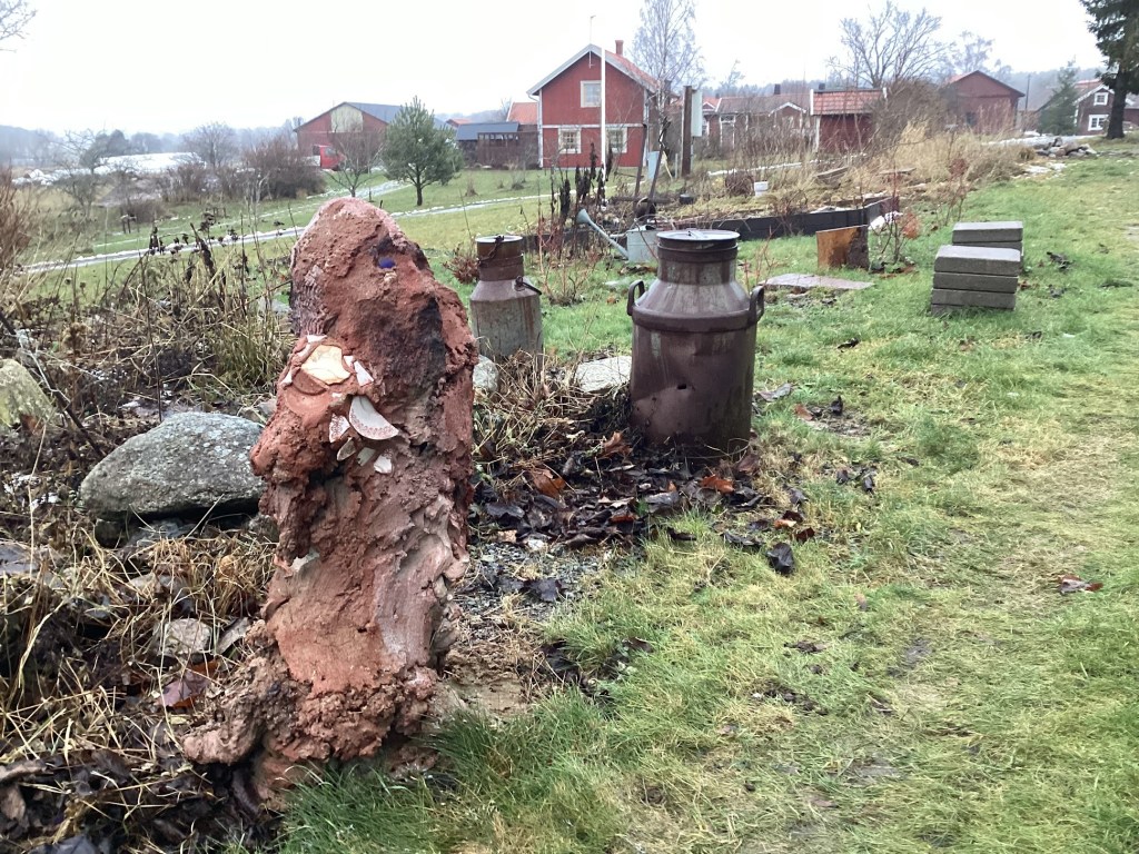 -När min man gjuter golv eller liknande så får han ofta cement över. Med den överblivna cementen bygger han på den där figuren. Den föreställer den enögda oden, säger hon.