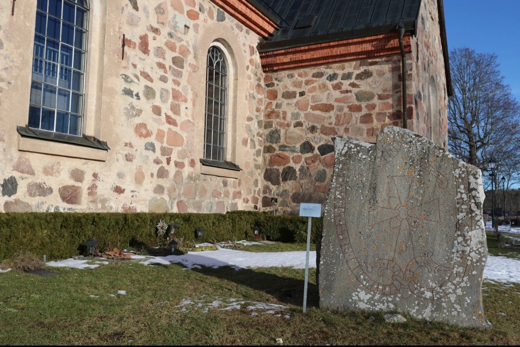 En annan runsten (U 214) är från början av 1100-talet. Den står inne i kyrkan och berättar på vers om ett vikingatida handelsskepp, en knarr, som förliste på havet: