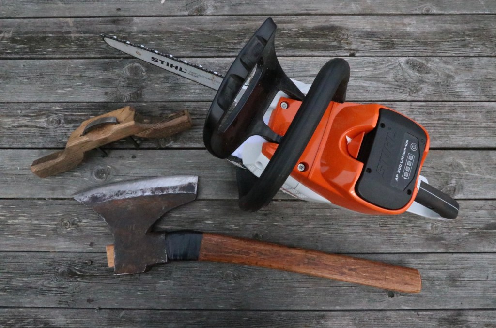 Forntid och nutid i samma verktygslåda. Bila, som är belagd från vikingatid, intill en moderna elsåg samt skave – en medeltida hybel.