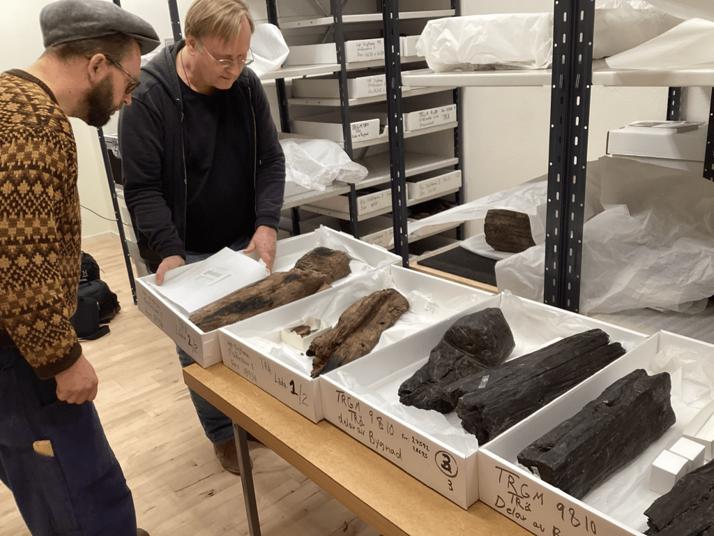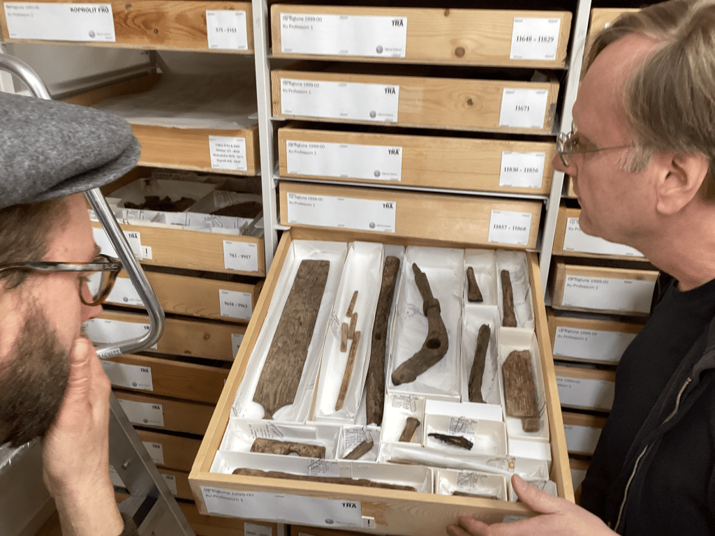 De fynd vi är intresserade av är ytterst få – men unika. Anders Söderberg tar fram en låda med några mörkfärgade och cirka 30 centimeter långa träföremål. Det blir tyst i rummet, förutom surret från klimatanläggningen som håller perfekt luftfuktighet.
