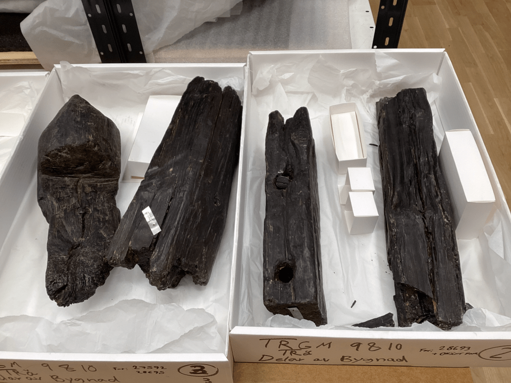 Unikt. Huslämningar från slutet av 900-talet. Den stockbit som nämns i artikeln är den tillspetsade i den mittersta lådan. Detta är sannolikt det äldsta kända belägget för timring av hus i Uppland. Spåren instocken vittnar om att det sannolikt är en husknut och att den i slutet av 900-talet hade återanvänds minst tre gånger. Stockbiten är alltså äldre än de kulturlager från sent 900-tal som den hittades nerslagen i.