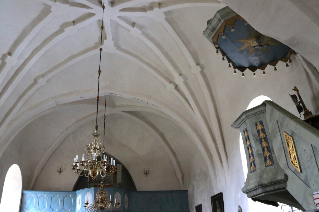 Valven i Haga kyrka har aldrig varit dekorerade med målningar. Till höger syns den lutande predikstolen.