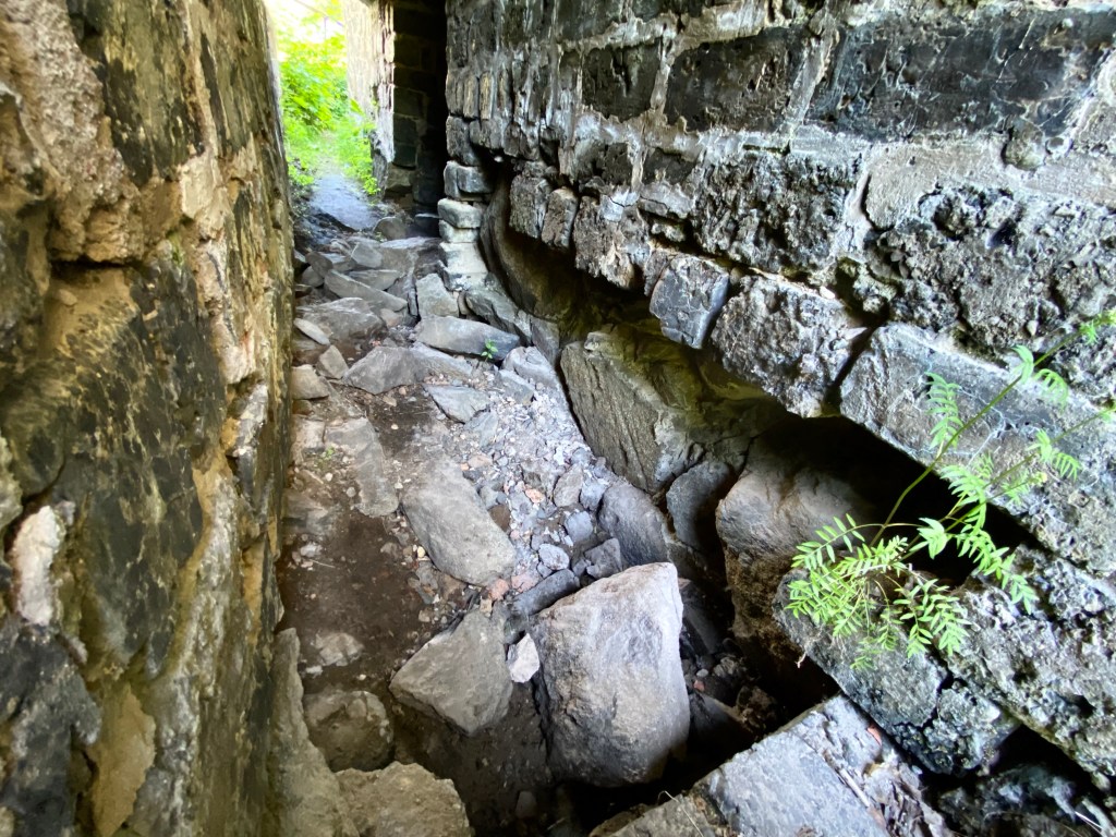 Denna bild är tagen från andra hållet, jämfört med tidigare bild. Här får man en uppfattning om hur djupt det har grävts. Notera stenarna som troligen härstammar från masugnens äldsta bebyggelsefas och som vräkts upp i gången i samband med den olagliga grävningen.