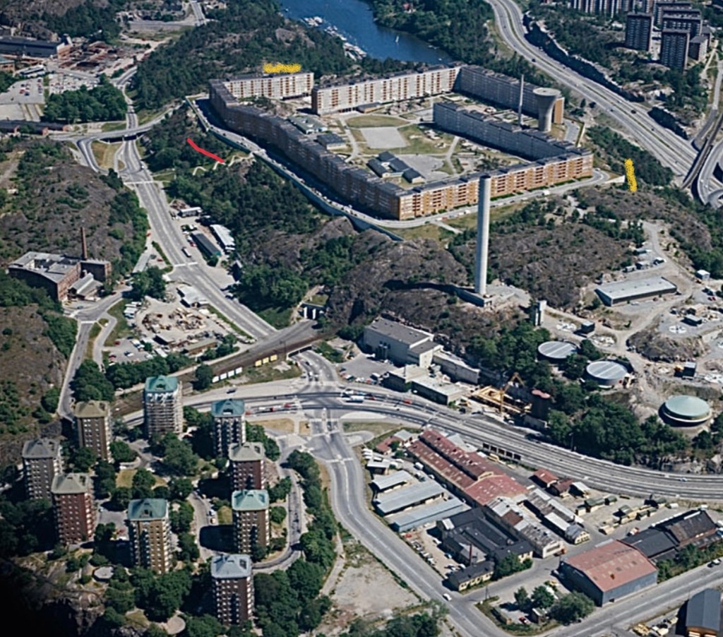 Året är 1970. Bakom skorstenen syns Henriksdalsberget med den nybyggda kransbebyggelsen med 700 bostäder. Det röda strecket markerar det ungefärliga läget för de registrerade murarna/vallarna. De gula sträcken anger var de platser med murliknande konstrukanges i artikeln och i Fornlämningsregistret.