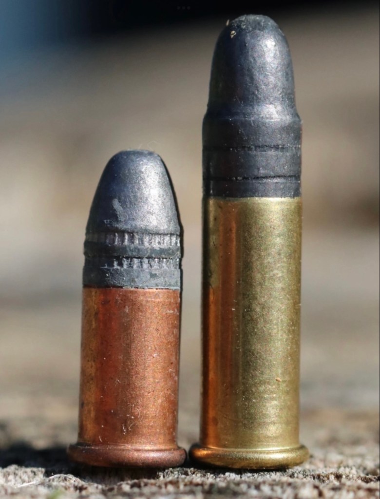 22 kort till vänster och 22 long rifle till höger. Den högra patronen är 2,5 centimeter hög.