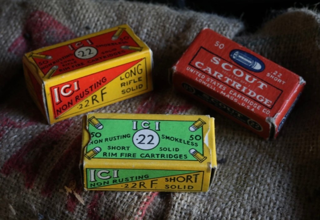 Ammunitionsaskar från för 22 long rifle och 22 kort från mitten av 1900-talet.