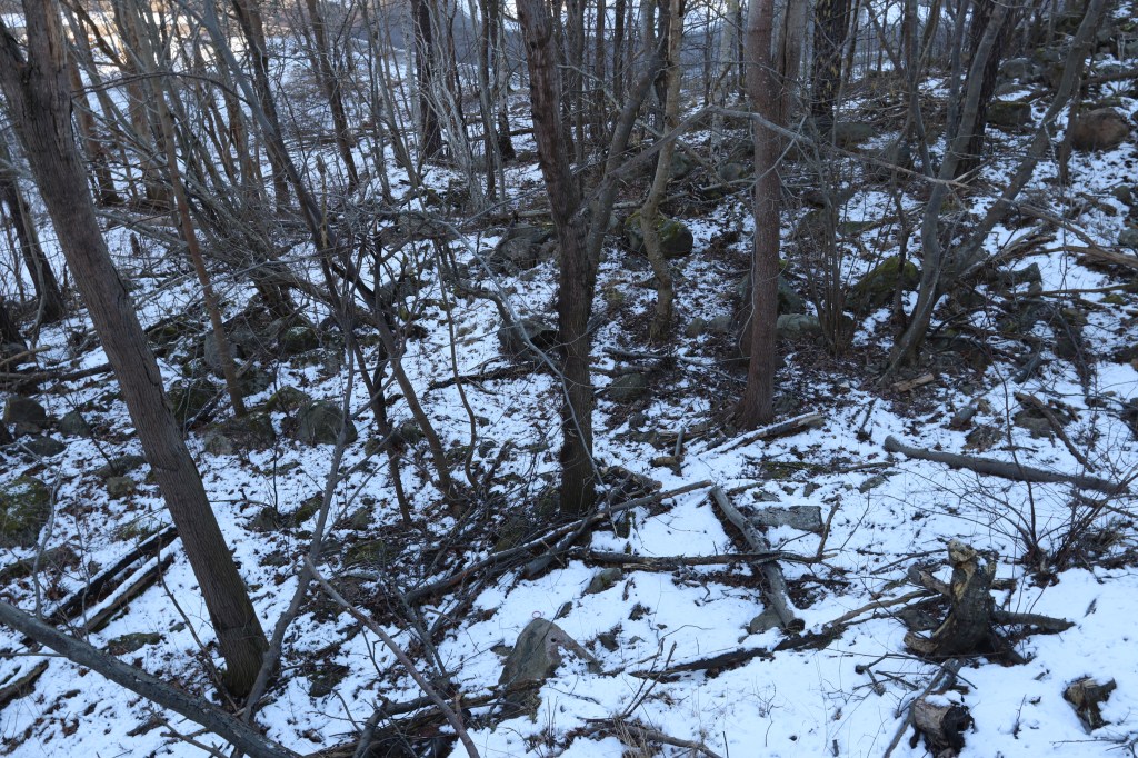 Vy över norrsluttningen där de fragmentariska murarna finns. Notera hur terrängen sluttar.