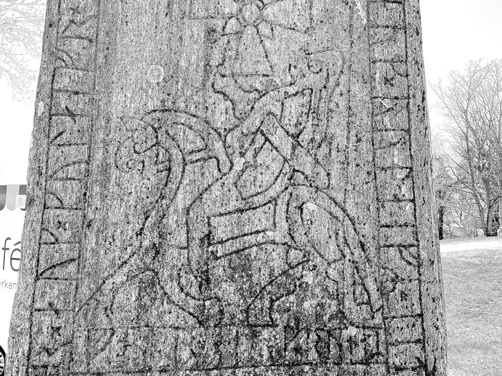 Två beväpnade ryttare som rider fram på den bearbetade stenytan. Skoklosterstenen är en av Sveriges mest udda runstenar. Den påminner om en bildsten och dess ristade ryttare med svärd och spjut kan vara 500 år äldre än den vikingatida runristningen.