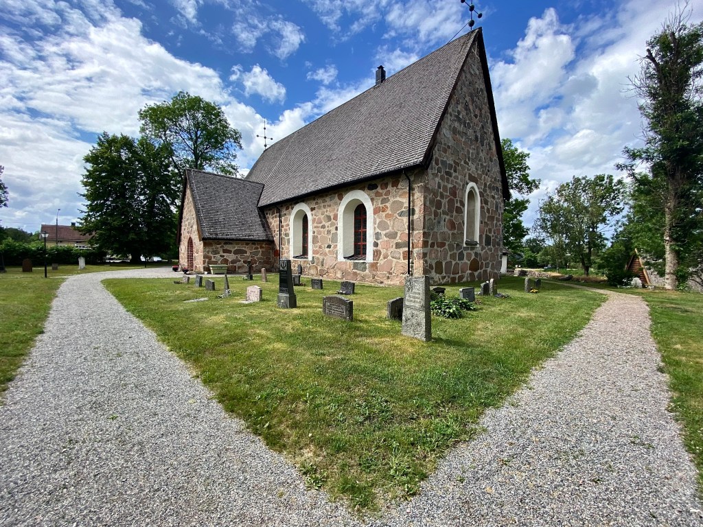 Edebo kyrka i Roslagen. Kyrkans äldsta delar, sakristian, är från 1200-talet och byggdes ursprungligen intill en äldre träkyrka. Den nuvarande kyrkans långhus är från slutet av 1400-talet.