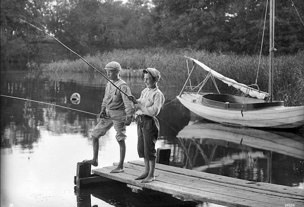 Det är Sverige, men oklart var. Var bilden är tagen spelar mindre roll. Hade det inte varit för pojkarnas kläder, avsaknaden från skor och den numera ovanliga segelbåten i bakgrunden, en så kallad Stjärnbåt, skulle bilden lika gärna vara tagen idag – vid en sommarvik där abborrarna lurar i vasskanten.