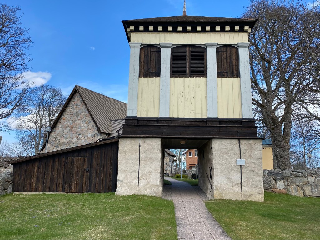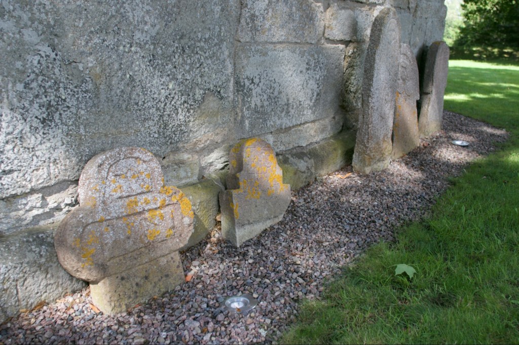 ”Här har vi samlat gamla gravstenar från kyrkogården. I dag går det inte längre att säga var de från början har stått, men här under tak kan de bättre bevaras för framtiden” skriver Svenska kyrkan.