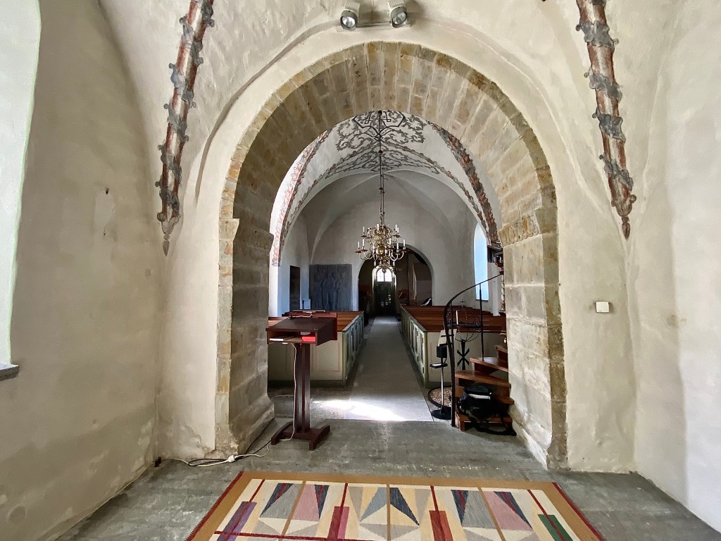 Kinne-Vedums rektangulära långhus – fotograferat från koret. I samband med restaureringen åren 1962-1964 återuppfördes den romanska/tidigmedeltida triumfbågen på sin ursprungliga plats, mellan långhuset och koret.