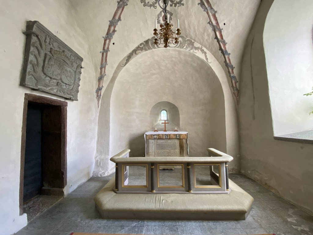 Koret, altaret och rundabsiden i Kinne-Vedum kyrka. Altaret har förblivit orört sedan 1100-talet och är unikt i Sverige.