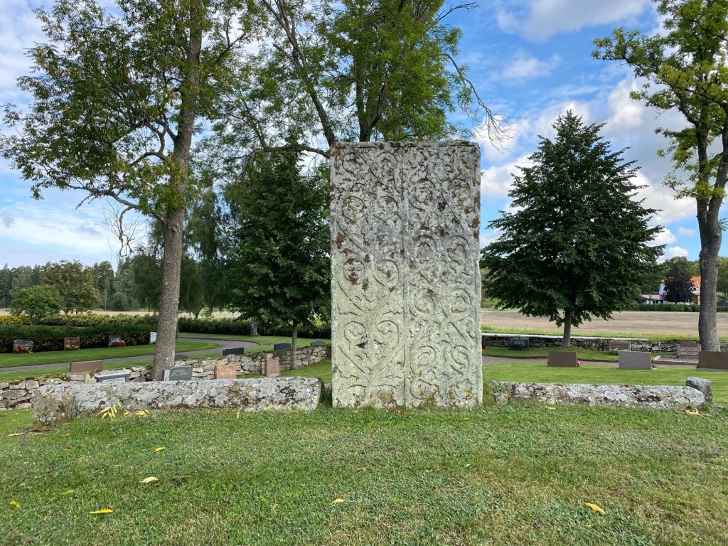 Den ytterst välbevarade gravhällen, där bildhuggarens mejselhugg fortfarande är tydliga, ger en inblick hur skickligt och fint huggna dessa gravmonument, som i vanliga fall är mycket slitna, var.