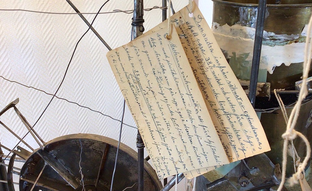 Detta är Karl Verner ”Evighets-Kalle” Erikssons maskin. Hur den är tänkt att fungera är oklart. På maskinens olika delar hänger gulnande och handskrivna lappar, som uppfinnaren själv har skrivit. Men informationen är inte direkt pedagogisk. Det krävs mer ingående studier för att förstå hans resonemang.