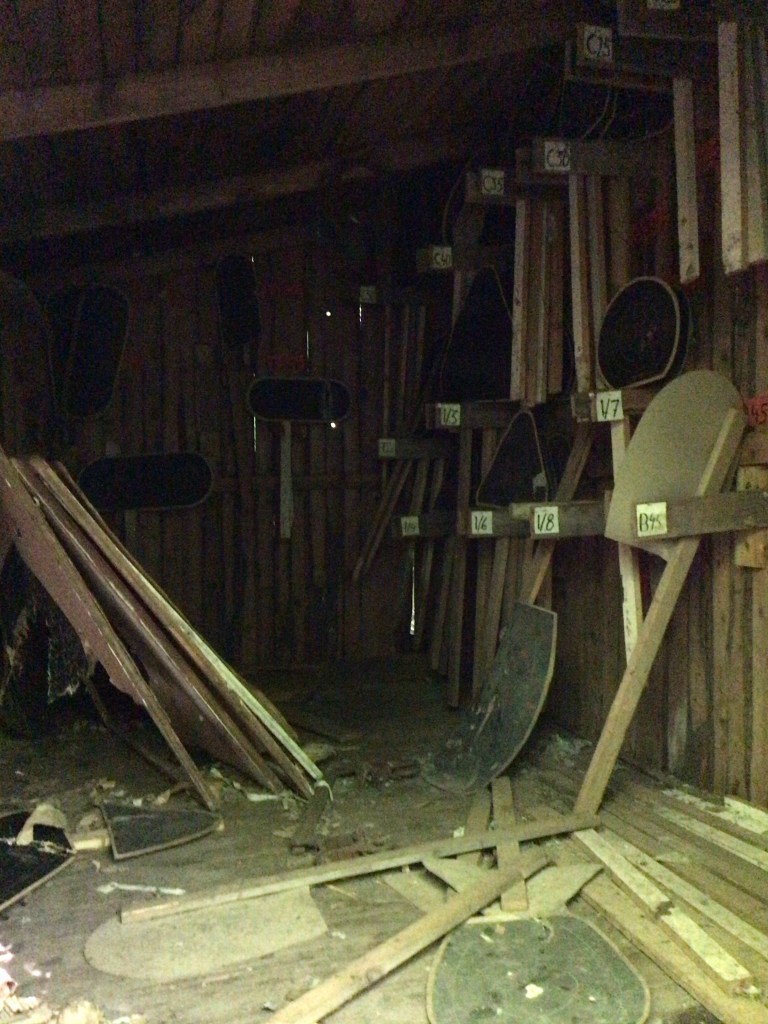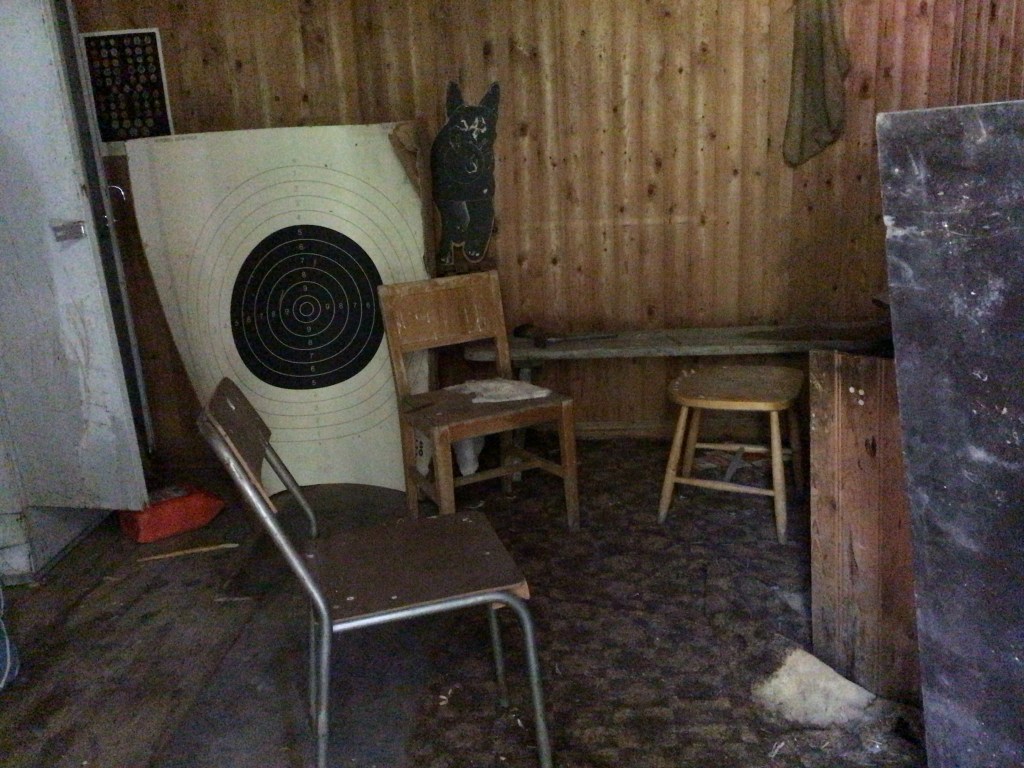På golvmattan, som en gång i tiden var röd, ligger tomhylsor, blekt godispapper, kapsyler och småbitar av skumgummi som mössen bitit loss från madrassen. Där inne är det tillräckligt högt för att stå upprätt. Av sängen, som består av en brädbotten och rester av en madrass, är det inte mycket kvar av.
