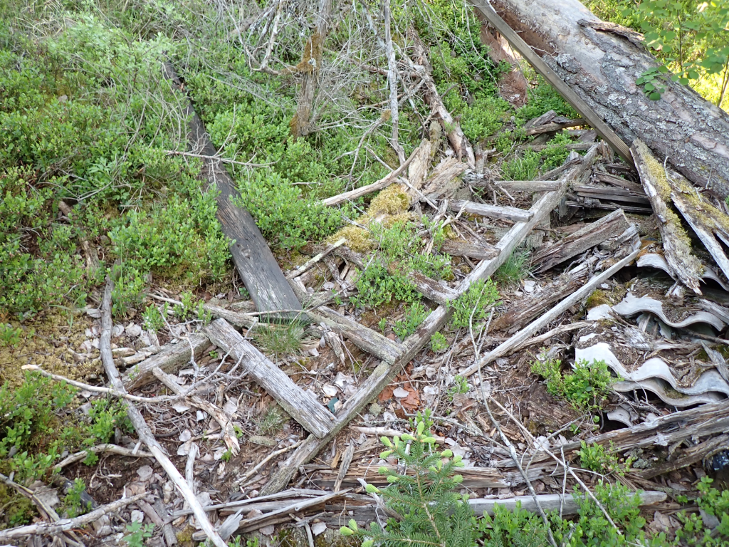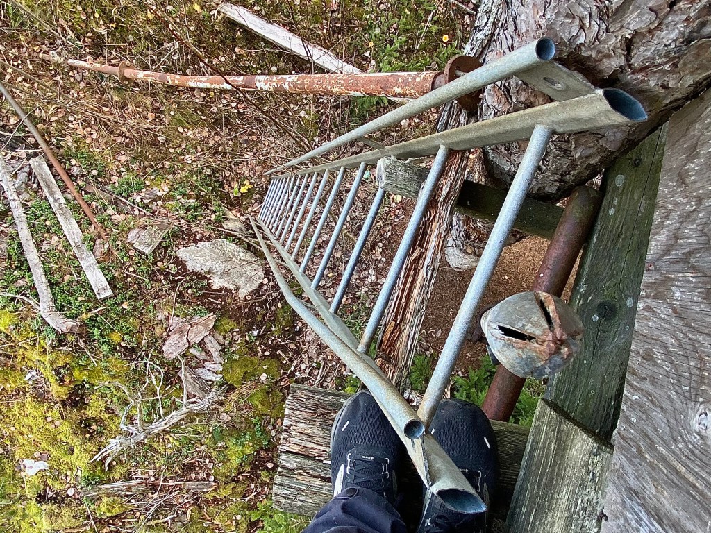 På marken nedanför tornet syns fortfarande rester av den stege av trä, som kasserades och ersattes av en kabelstege, för länge sedan. Lyfter man på mossan kommer det fram sneda spikar och rostiga beslag.