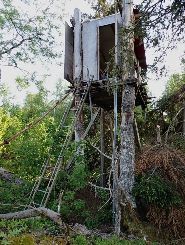 Det är en i högsta grad märklig byggnad – ett jakttorn med väggar, tak och säng, byggd på en plattform mellan fyra träd – fem meter över marknivån. Delar av konstruktionen består av en byggnadsställning.
