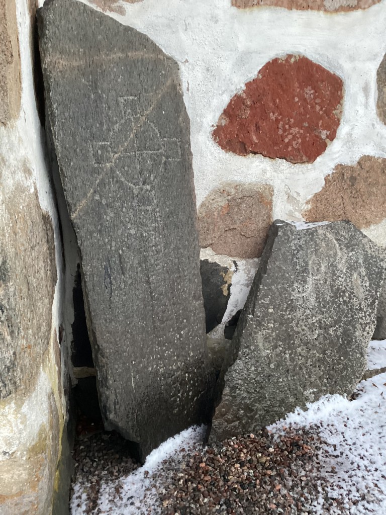 Gravstenen, som i toppen är dekorerad med ett ringkors, borde vara samtida med stenkyrkans äldsta delar – som är från 1200-talet. En intressant detalj är ringkorsets horisontella korsarm, som i bägge ändor avslutas med en upp- och nerböjd böjd – vilket påminner om en svastika. Denna detalj är lättast synlig i släpljus. Om det är en synvilla, felhuggning eller medveten utsmyckning är oklart.