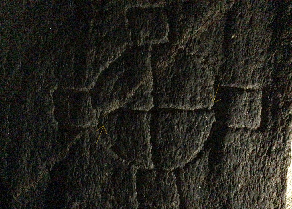 Stenblocket som tidigare i reportaget markerats med en blå pil. Den vänstra sidan av blocket vätter mot den terrasserade sträckan. De gula strecken markerar jordmassorna som är upplagda mot blocket. Terrasseringen upphör i höjd med detta stenblock. På blockets högra del (markeras av en gul pil), där det inte finns någon terrassering, finns inte heller några upplagda jordmassor.