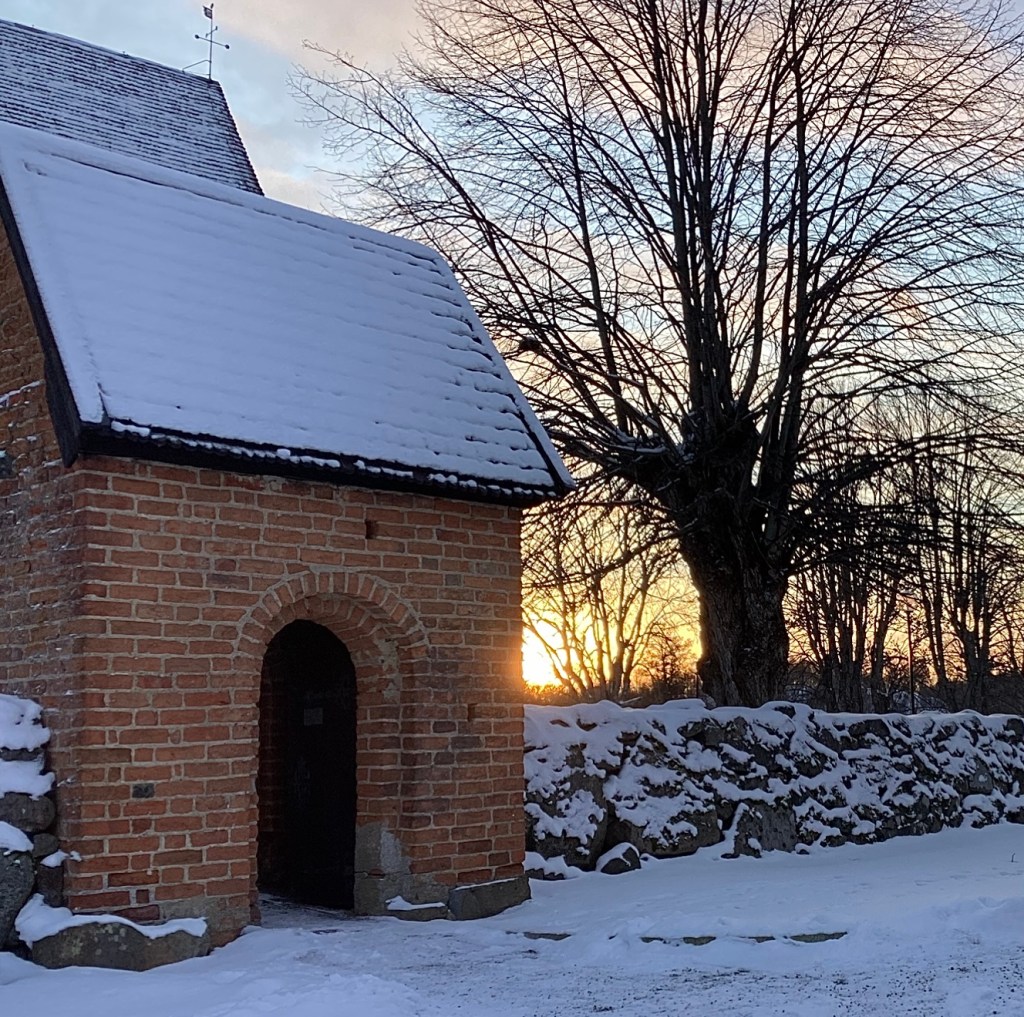 En decemberkväll vid Frötuna kyrka anno 2021. Stigluckan av tegel är från medeltiden. Strax intill stigluckan, intill muren till höger i bilden, ruvar jorden på hemligheter. Där, utanför den kyrkliga gemenskapen, finns gravar som grävdes sönder sommaren 2008. Dessa gravar sträcker sig sannolikt fram till stigluckan.