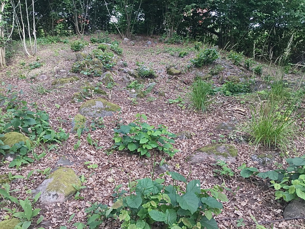 Den terrasserade sträckan av stigen, med stenblocket som nämns här ovan och som markerar början eller slutet av terrasseringen. Det röda strecket markerar den naturliga nivån i terrängen från vilken stigens horisontella yta utgår från. De svarta strecken är stigens ungefärliga mittpunkt. De gula strecken markerar dels stigens yttre avgränsning (innan det börjar slutta) samt de jordmassor som är upplagds – bland annat mot stenblocket. Det blå strecket markerar terrasseringens nedre begränsning.Samma bild som ovan men utan färgglada markeringar.