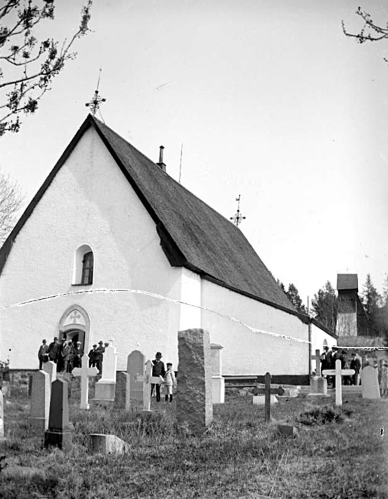 Häverö kyrkas sedd från kyrkogårdens västra ingång. Notera den märkliga gången genom långhusets nordvästra hörn.