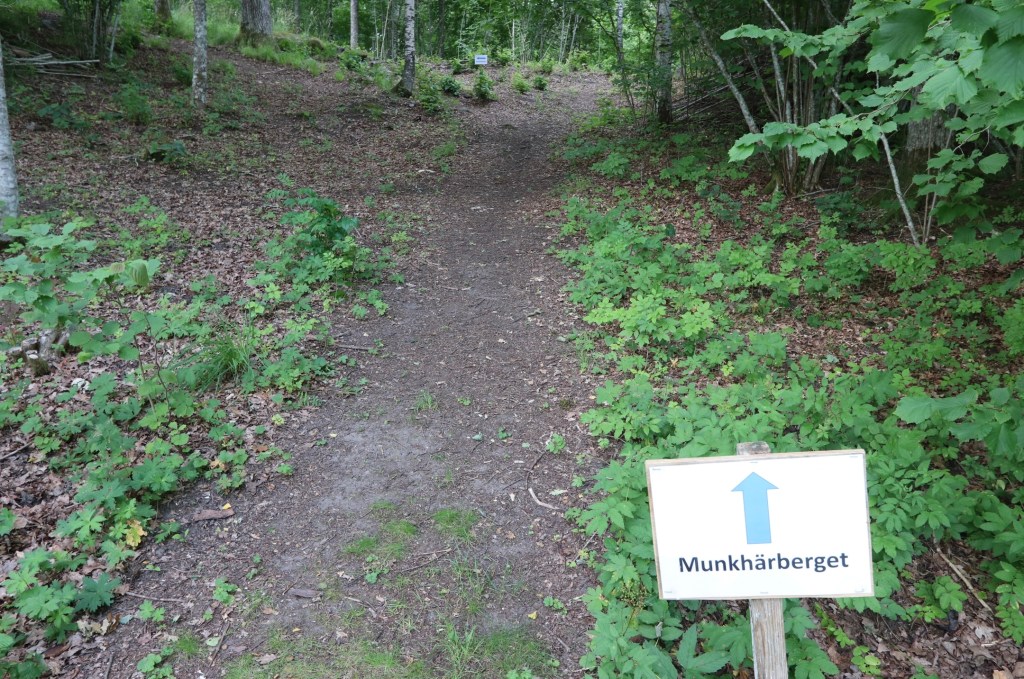 Den cirka femtio meter långa, terrasserade sträckningen av stigen. Den blå pilen i bildens bakgrund markerar det stenblock som nämns här näst i reportaget.