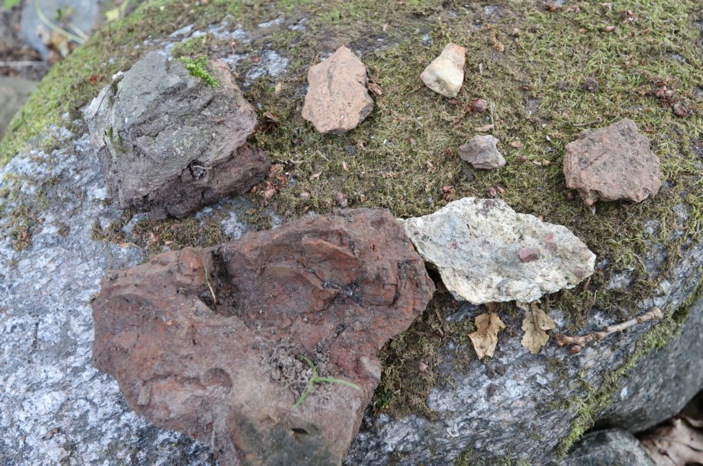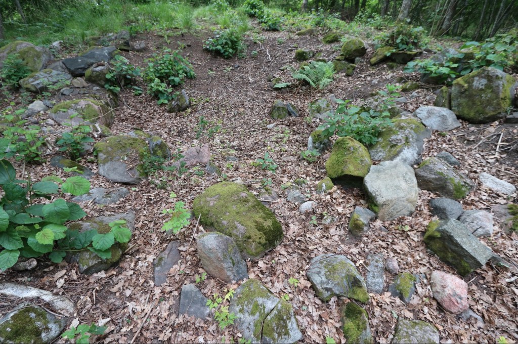 Vid terrassens sydöstra del (som är markerad med en blå pil på fotografiet längre upp i reportaget), där terrängen övergår till relativt plan mark, finns ett stenblock intill stigen. På den norra sidan av stenblocket, som vätter mot den terrasserade delen av stigen, syns tydligt hur jordmassorna från terrasseringen har lagts upp mot stenblocket. På stenblockets södra sidan, där terrasseringen upphör, finns inga jordmassor upplagda och blockets profil är tydlig. Hade det varit en strandvall borde jordmassorna ha tryckts upp på bägge sidor om stenblocket.
