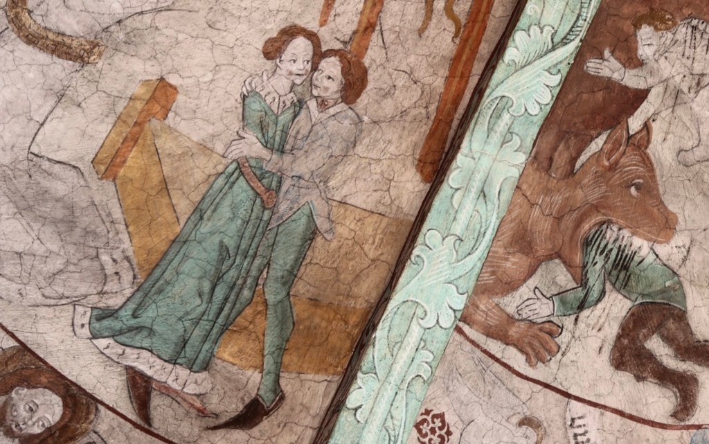 Bonaden från Skog är ett unikt kulturarv från 1200-talet. Bilden ovanför är ett utsnitt av bonaden, där ett gytter av märkliga figurer och symboler. Här ser vi en kyrka och en klockstapel till höger. Två personer ringer i klockorna. Foto: Nordiska Museet.