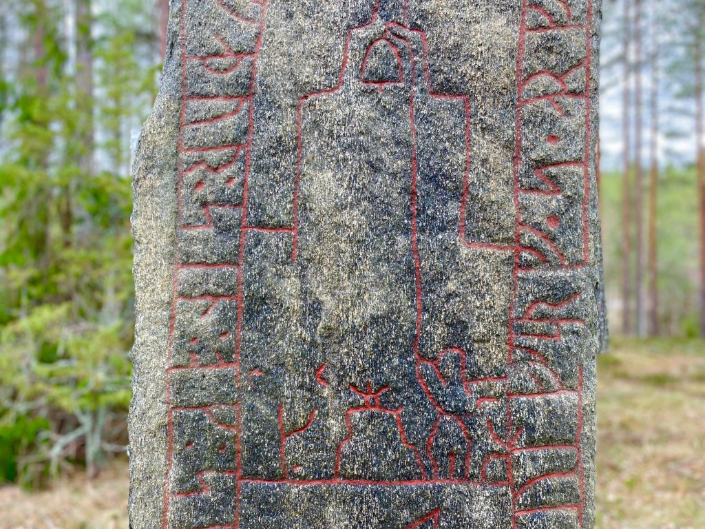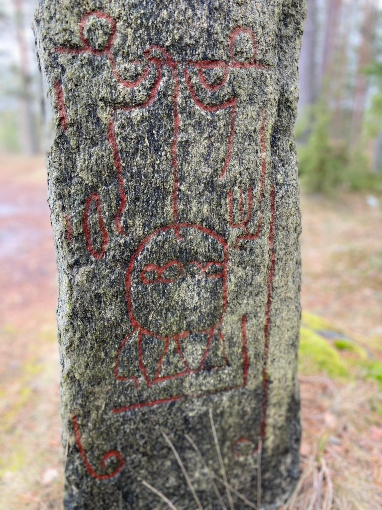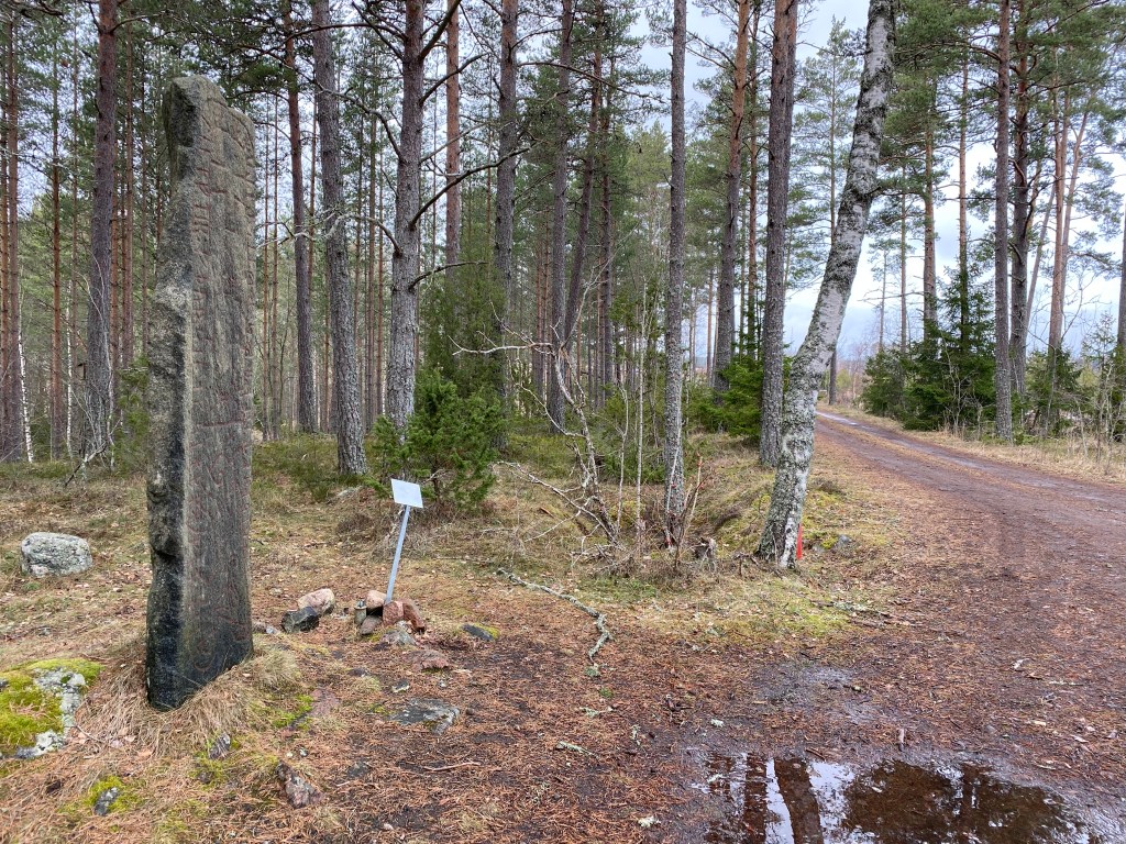 Det fem meter breda flyttblocket, med sina två formmässigt och innehållsmässigt utsökta runristningarna, är verkligen en plats där historiens vingslag flaxar runt de intilliggande granarna. En liten men intressant detalj är ett mindre stenblock med flat yta intill stigen – bara någon meter från den ena ristningen där Ragnvald berättar om sig själv. Det är ett stenblock som är perfekt att sitta på.