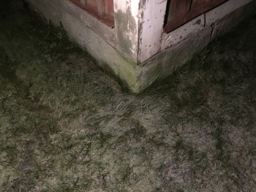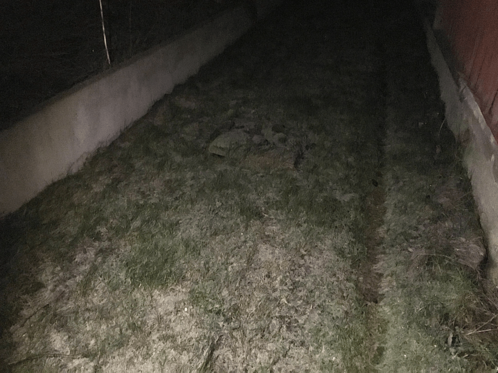 Någonstans mellan betongsockel till vänster och husgrunden till höger, påträffades mänskliga kvarlevor 1937. Mycket tyder på att det var hantverkaren Karl, som försvann spårlöst 35 år tidigare, som hade grävts ner bakom huset.