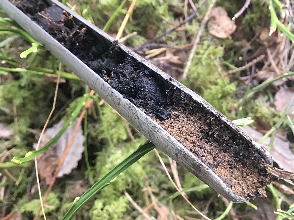 Med en jordsond, som är ett lika enkelt som viktigt redskap inom arkeologin, kan enkelt få en uppfattning om det finns lämningar efter kolning i marken. Längst ner i provet syns den sterila sanden/moränen och där över ett djupt kol- och sotlager.