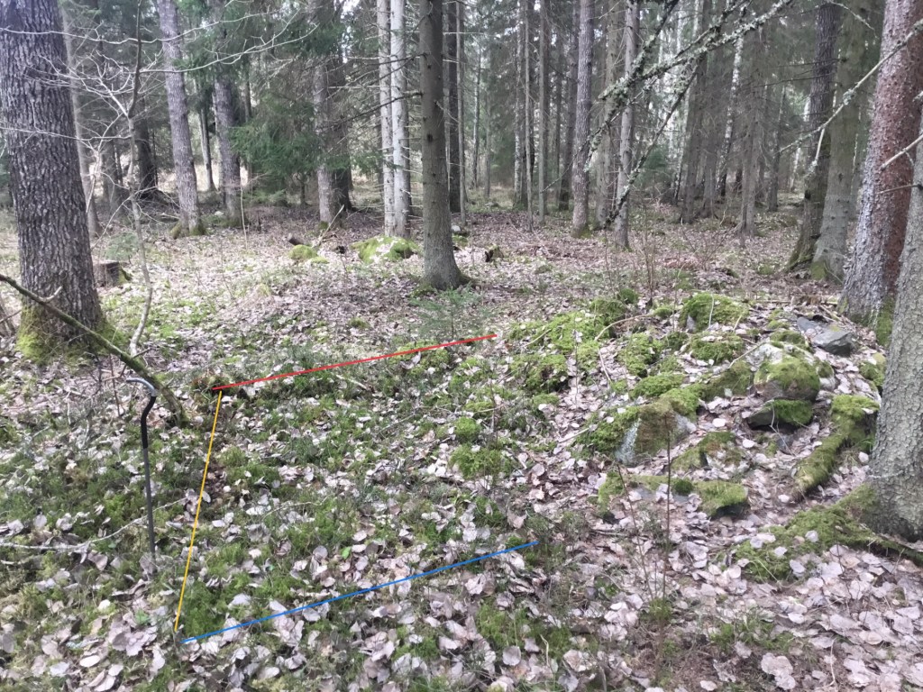 Typisk lämning från en kolarkoja cirka 300 meter från artikelförfattarens tomt. Till höger i bild syns ett stenröse, som är resterna av den kallmurade eldstaden. Väggarna är för länge sedan borta, men svaga upphöjningar i marken avslöjar kojans storlek. Gult streck: kojans kortsida. Rött streck: norra långsidan. Blått streck: södra långsidan. Observera att strecken är inte exakta.