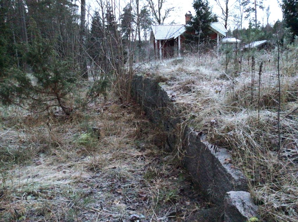 Ruinens norra vägg.Ruinen (källare?) fotad från väster. Längst bort i bilden syns den gräsbevuxna platån där korset är rest.