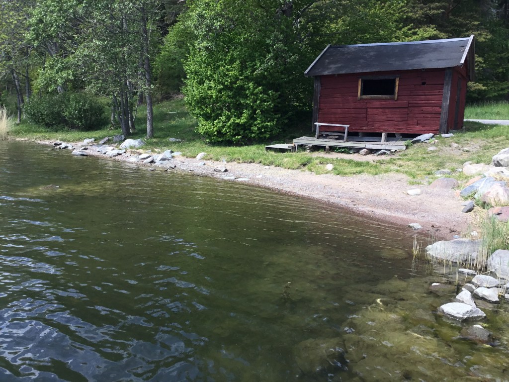 Det finns även andra spår från sjöfart i viken. Intill stranden står en stocktimrad och vindpinad liten bod med tjärade knutbrädor. Boden verkar sedan länge haft en funktion som mötesplats av något slag – kanske som väntrum.